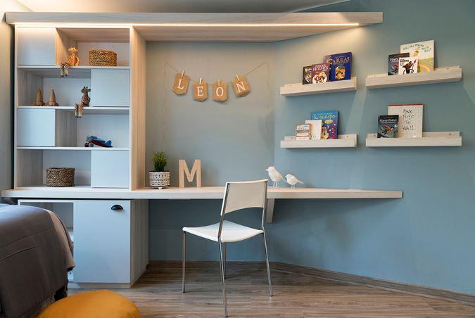 Muebles a medida para dos espacios abandonados . El primero fue un escritorio a la medida para teletrabajar con la mejor vista de la casa y el otro, el dormitorio infantil de su hijo, que con el cambio de casa, no podía quedarse atrás.